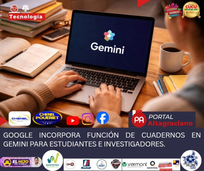 Una persona joven, vista desde el hombro derecho, utiliza una laptop con el logo de Gemini en la pantalla, rodeada de libros, cuadernos y una…