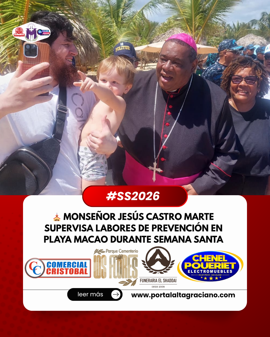 Macao, La Altagracia.– El obispo de la Diócesis de Higüey, Jesús Castro Marte, realizó un recorrido de supervisión en la playa Macao como parte de las acciones de prevención desarrolladas durante la Semana Santa 2026.