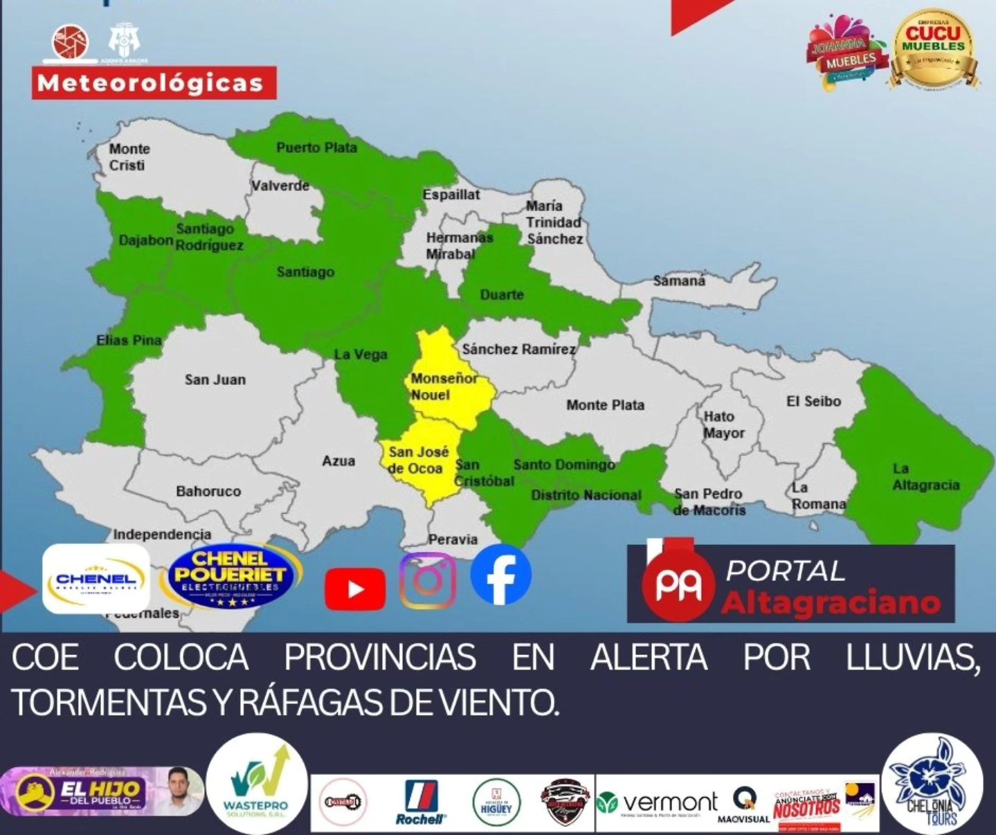 El Centro de Operaciones de Emergencias informó que mantiene dos provincias en alerta amarilla y elevó a diez, junto al Distrito Nacional, en alerta verde, debido a las condiciones climáticas inestables que afectan al país.