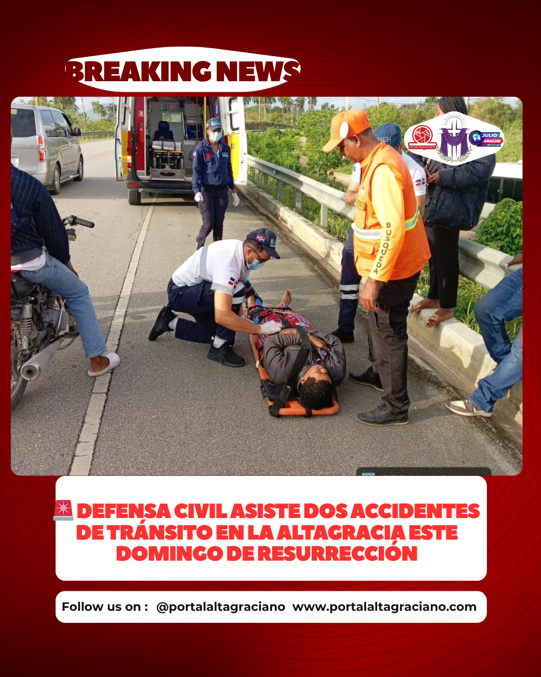 La Altagracia.– Personal de la Defensa Civil brindó asistencia la mañana de este domingo a dos accidentes de tránsito ocurridos en distintas localidades de esta provincia, como parte del operativo de Semana Santa 2026.