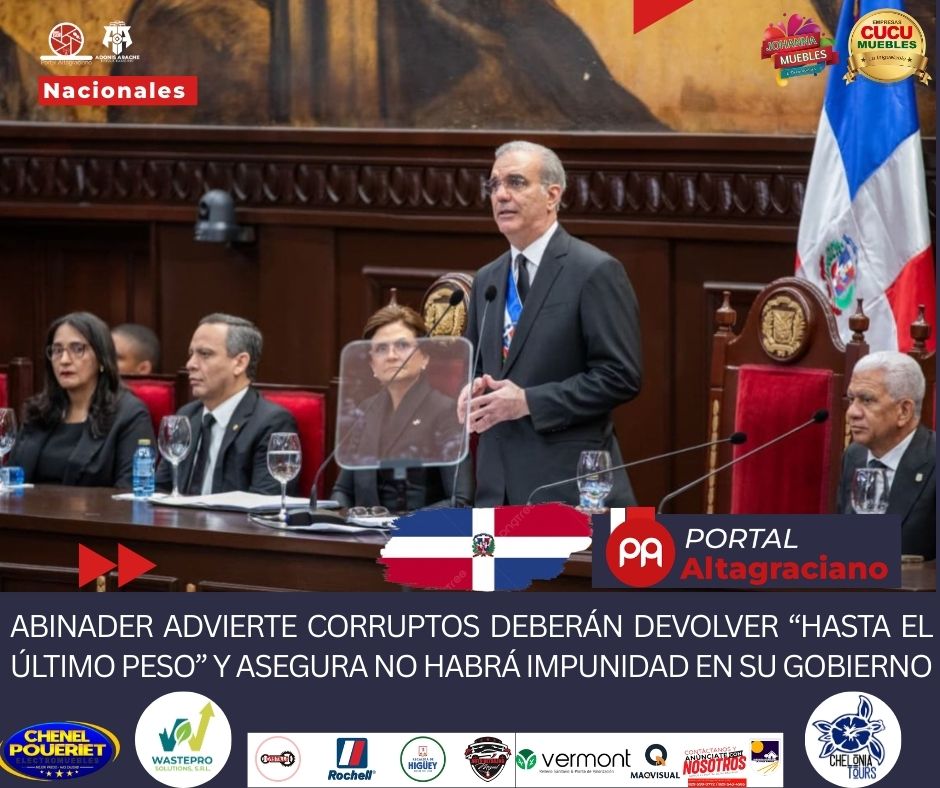 Santo Domingo. – El presidente Luis Abinader afirmó este viernes, durante su discurso de Rendición de Cuentas ante la Asamblea Nacional, que en los casos de corrupción, como el de SeNaSa, los responsables no solo enfrentarán todo el peso de la ley, sino que estarán obligados a devolver hasta el último peso de lo robado.