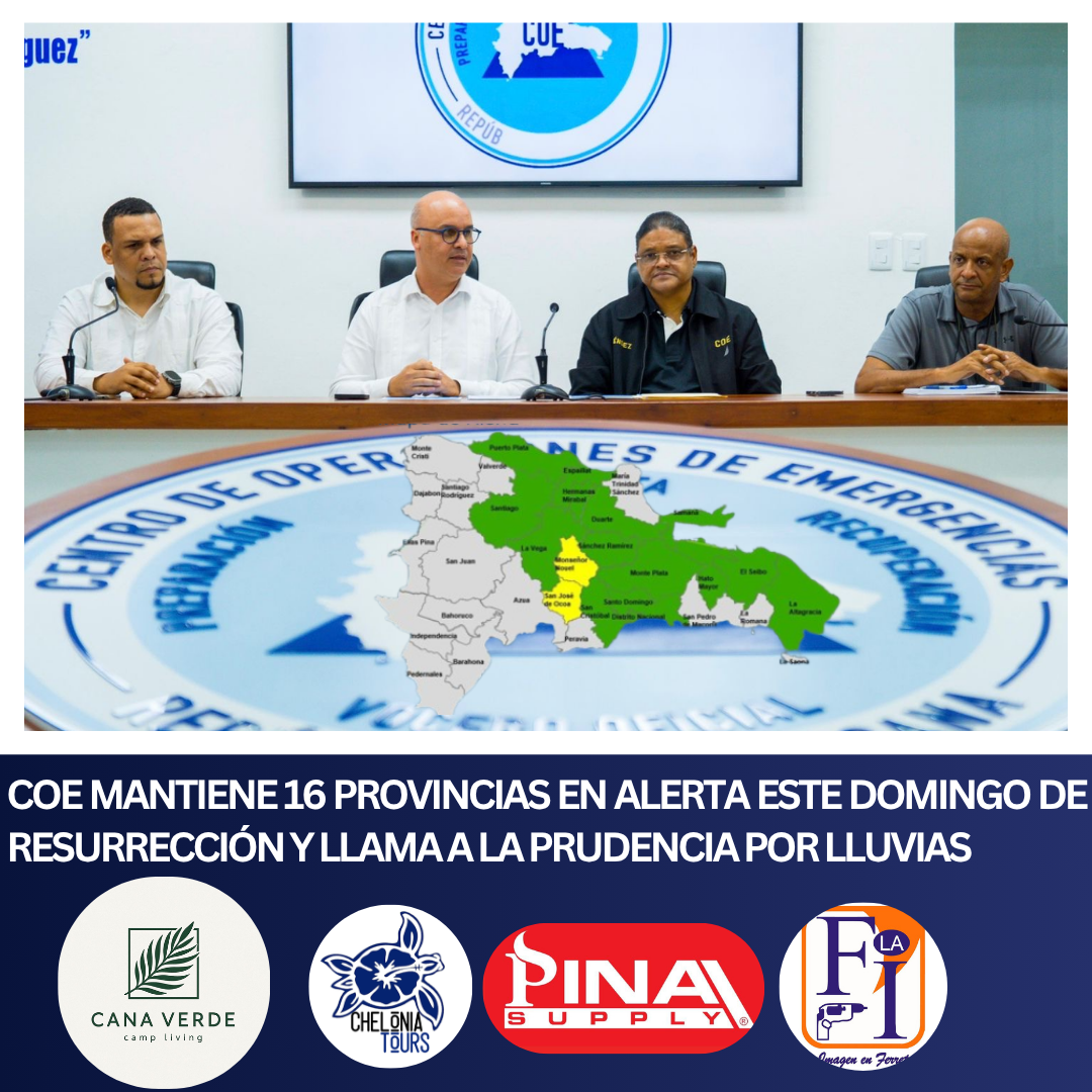 En tanto, permanecen en alerta verde el Distrito Nacional, la provincia Santo Domingo, así como Sánchez Ramírez, La Vega, Puerto Plata, San Cristóbal, Santiago, Espaillat, Duarte, Samaná, María Trinidad Sánchez, Monte Cristi, Hato Mayor y El Seibo.