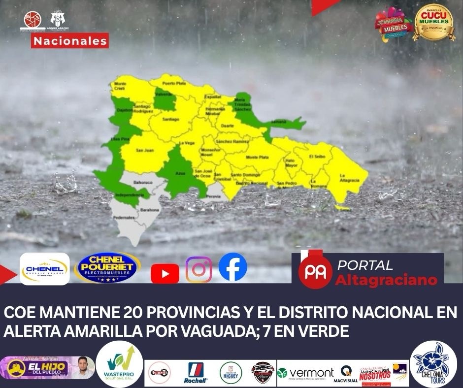 El Centro de Operaciones de Emergencias (COE) informó que mantiene 20 provincias y el Distrito Nacional en alerta amarilla, mientras que otras siete permanecen en alerta verde, debido a un ambiente húmedo e inestable provocado por una vaguada, el calentamiento diurno y la incidencia del viento del este/sureste.