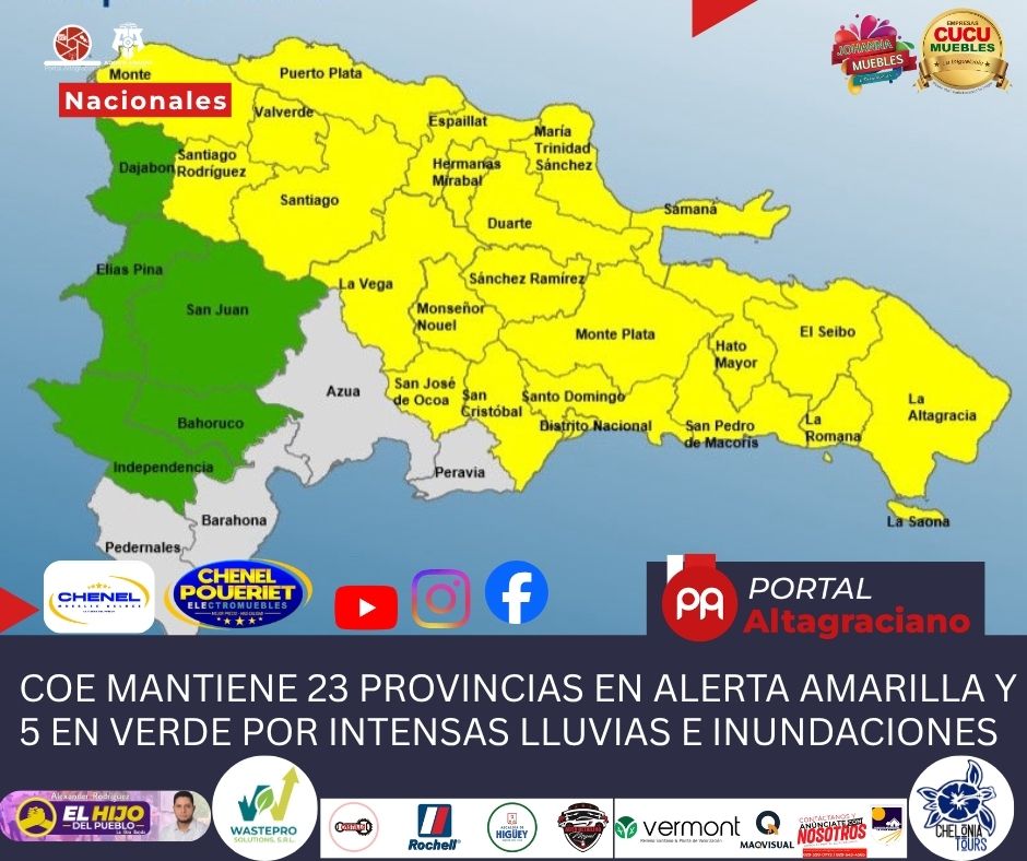 El Centro de Operaciones de Emergencias (COE) informó que mantiene 23 provincias en alerta amarilla y cinco en alerta verde, debido a las lluvias persistentes y al riesgo de inundaciones urbanas y rurales, crecidas de ríos, arroyos y cañadas, así como posibles deslizamientos de tierra.