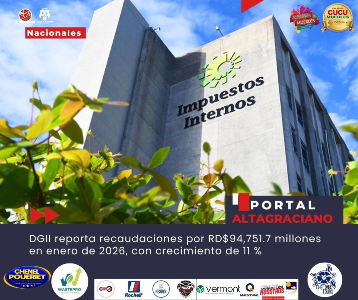 La Dirección General de Impuestos Internos (DGII) informó que las recaudaciones correspondientes a enero de 2026 alcanzaron los RD$94,751.7 millones, reflejando un aumento de RD$9,426.2 millones en comparación con el mismo período del año anterior.