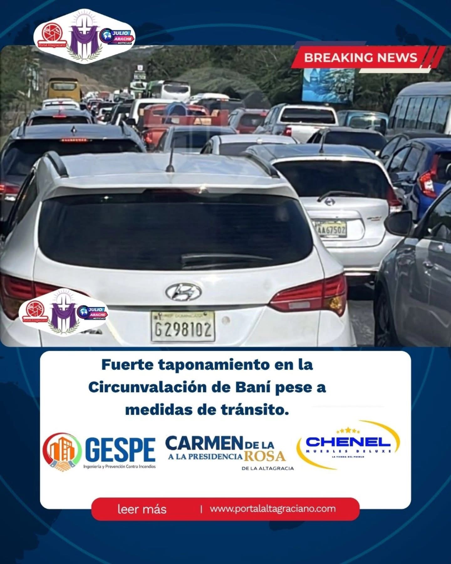 Este Jueves Santo, 2 de abril de 2026, se registra un fuerte taponamiento vehicular en la Circunvalación de Baní, en dirección hacia el sur de la República Dominicana, según reportes de medios locales.