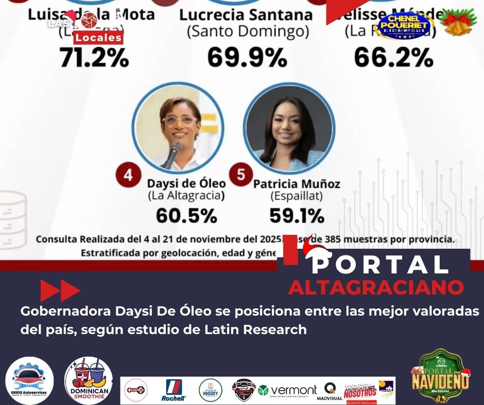 La gobernadora civil de la provincia La Altagracia, Dra. Daysi De Óleo, figura entre las gobernadoras mejor valoradas de la República Dominicana, de acuerdo con el más reciente estudio de percepción publicado por Latin Research, correspondiente a noviembre de 2025.