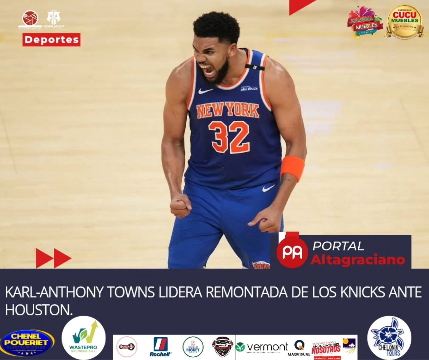 El dominicano Karl-Anthony Towns anotó 25 puntos, mientras que Jalen Brunson aportó 20, para que los New York Knicks remontaran una desventaja de 18 puntos en el último cuarto y vencieran 108-106 a los Houston Rockets la noche del sábado.