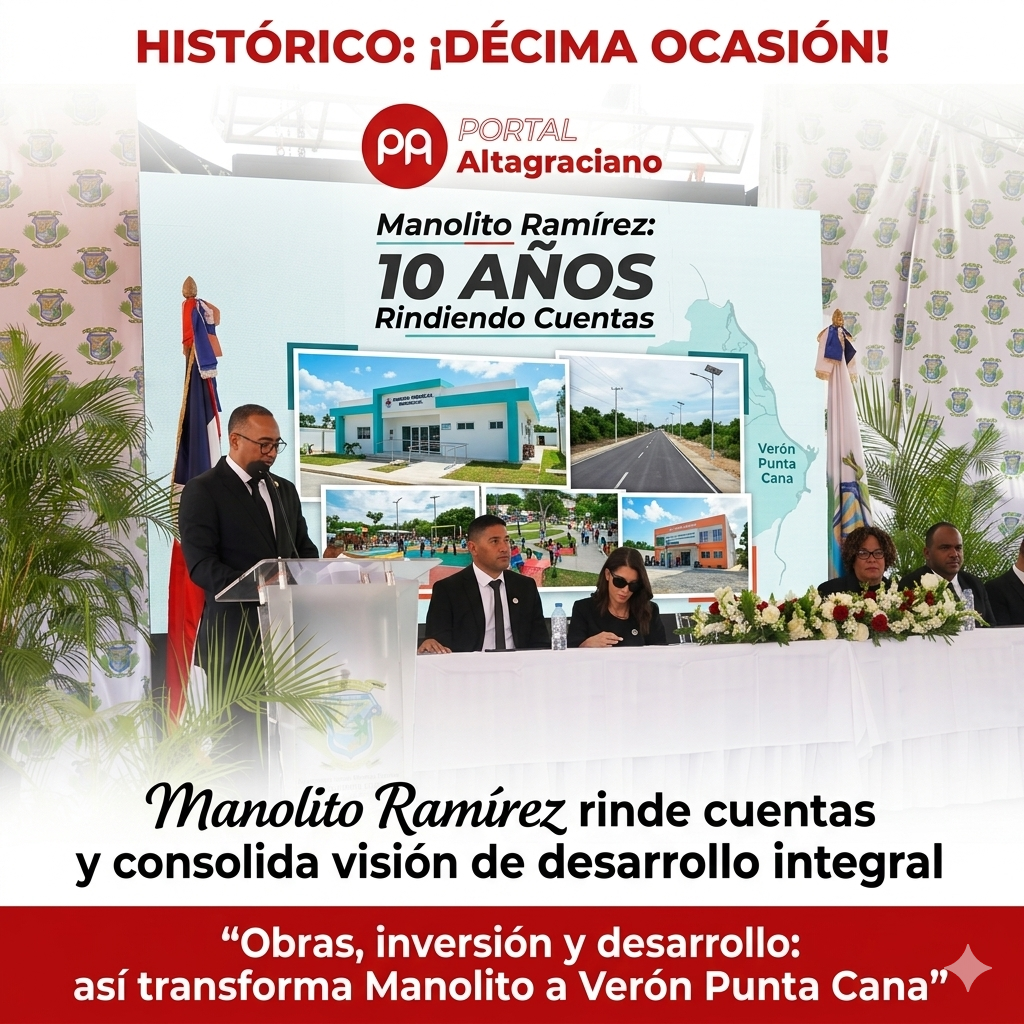 Verón Punta Cana, La Altagracia.– En un acto solemne marcado por la transparencia, la rendición de resultados y una visión estratégica de futuro, el director distrital Manolito Ramírez presentó su décima rendición de cuentas, reafirmando su compromiso con el desarrollo sostenible del Distrito Municipal Turístico Verón Punta Cana.
