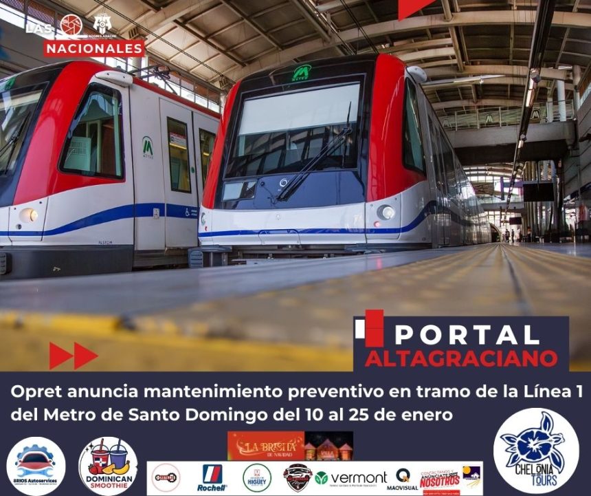 La Oficina para el Reordenamiento del Transporte (Opret) anunció que a partir de este sábado 10 de enero y hasta el domingo 25, se estará realizando un mantenimiento preventivo programado en un tramo de la Línea 1 del Metro de Santo Domingo.