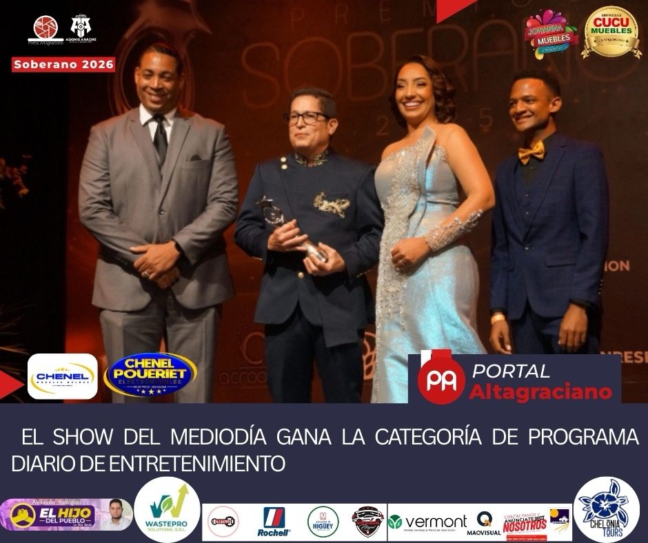 Santo Domingo, RD. – El reconocido espacio televisivo El Show del Mediodía fue galardonado como Programa Diario de Entretenimiento en la más reciente edición de los Premios Soberano 2026, consolidando su trayectoria como uno de los programas más influyentes y longevos de la televisión dominicana.