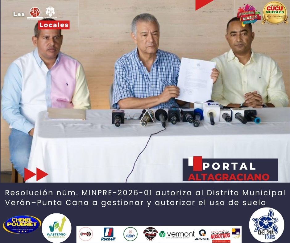 Verón–Punta Cana, La Altagracia. – El Ministerio de la Presidencia emitió la Resolución núm. MINPRE-2026-01, mediante la cual determina que, conforme a la normativa vigente en materia de ordenamiento territorial, uso de suelo y asentamientos humanos, los gobiernos locales de determinados distritos municipales gestionen y autoricen el uso de suelo dentro de su demarcación territorial, incluyendo al Distrito Municipal Verón–Punta Cana.