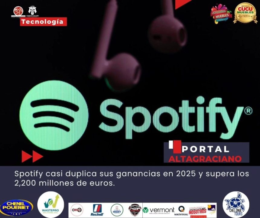 La plataforma musical sueca Spotify reportó este martes una ganancia neta de 2,212 millones de euros en 2025, lo que representa un incremento del 94 % en comparación con el año anterior, cuando la empresa cerró por primera vez un ejercicio anual con beneficios.